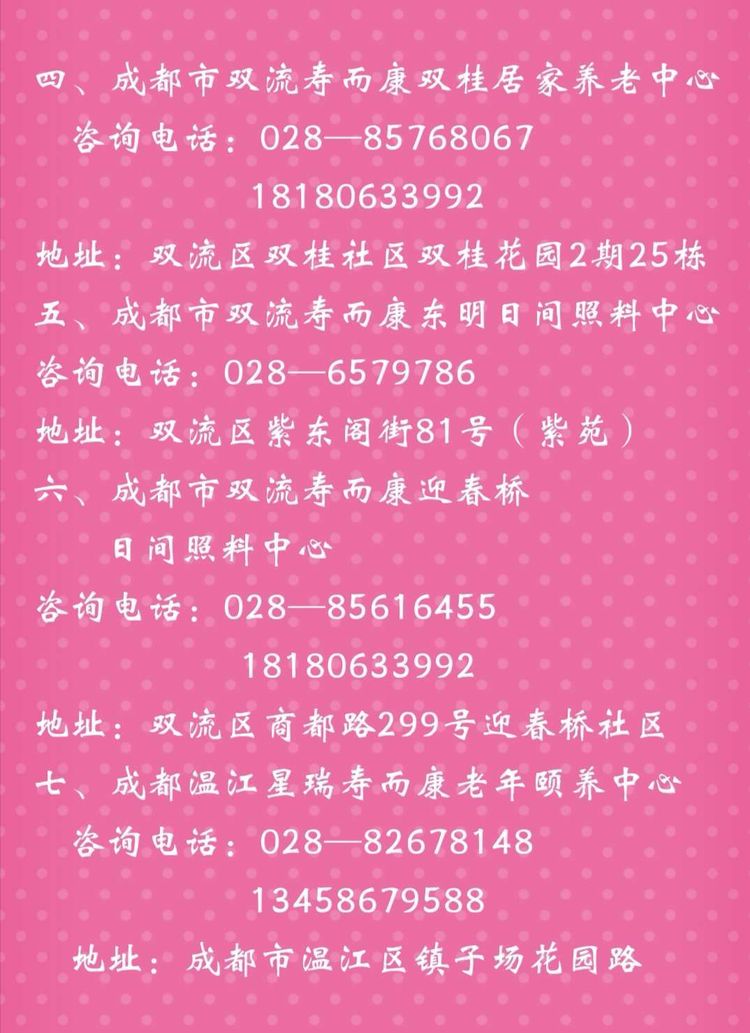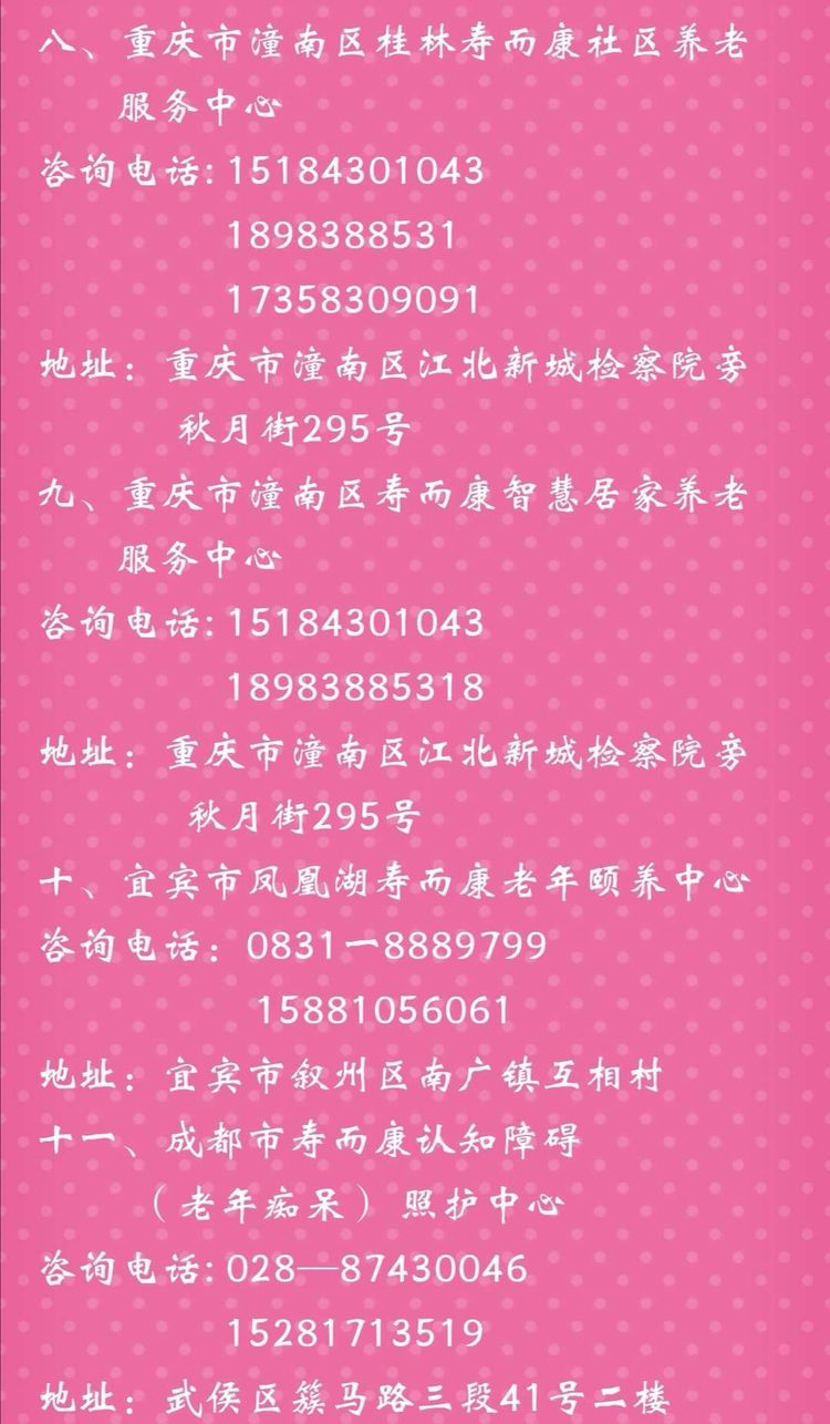 以下是壽而康養老連鎖機構各分部的詳細地址和聯(lián)系電話(huà)。歡迎參觀(guān)、咨詢(xún)!